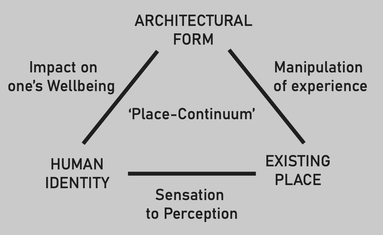 The problem with that scenographic approach has led to context-less environments propelling conditions of urbanisation like suburban sprawl and the removal of one’s association with the natural world. This brings me back to a framework for design that I developed in my final undergraduate year (Bachelor of Architectural Studies). Place-continuum examines an exploration of cohesion between three concepts, Existing Place, Architectural Form, and Human Identity and discusses the ways they intersect.
